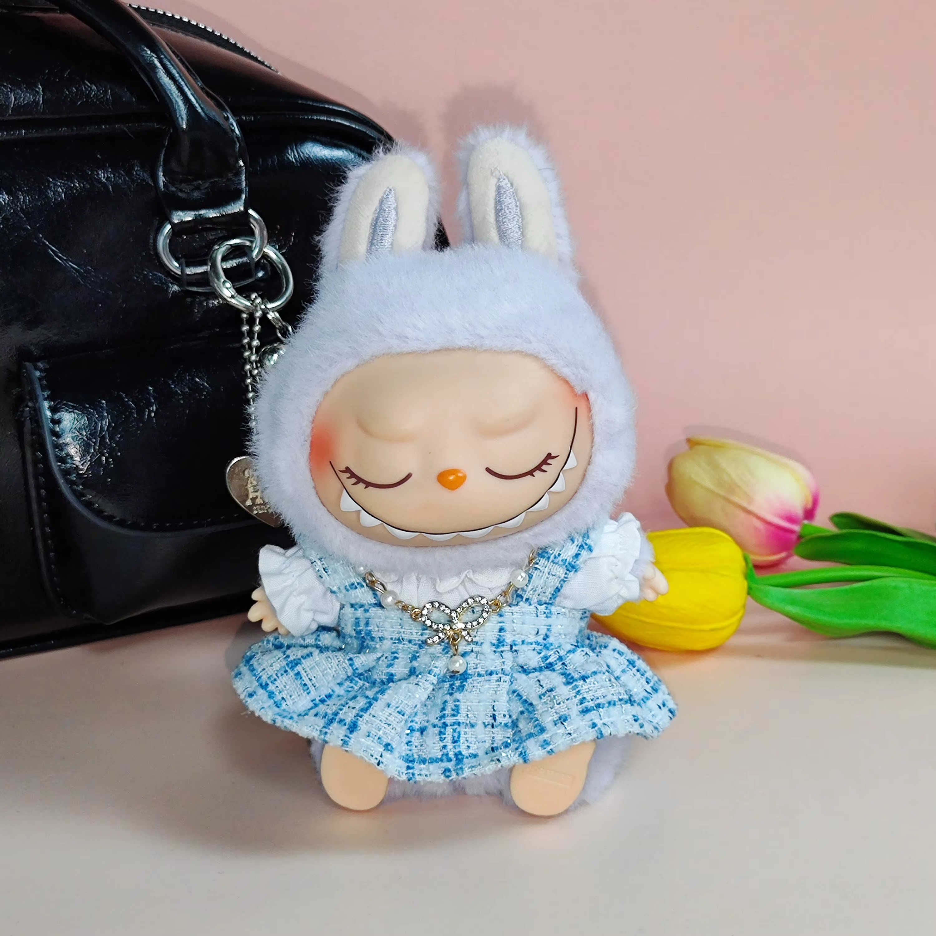Caja sorpresas Labubu 17 cm – Caja con llavero artesanal y conjunto de traje de oso para la muñeca Labubu.
